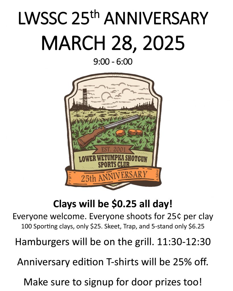 Come out and celebrate our 25th anniversary with $0.25 clays. All targets for Saturday 9:00-6:00 will be $0.25 each for everyone, member or not.